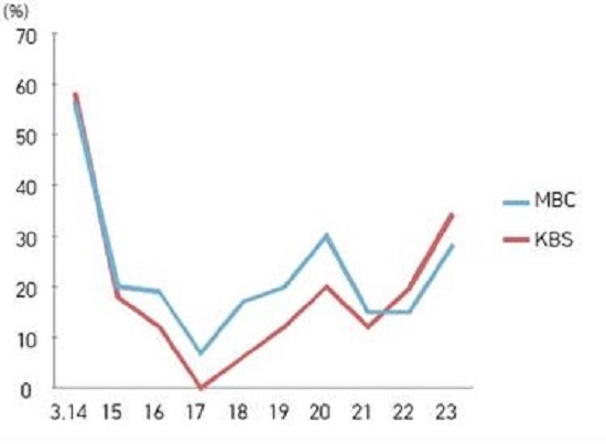이처럼 뉴스 꼭지의 순서를 정해 한 편의 극으로 구성해내는 데 MBC와 KBS는 유사해 보인다. 뉴스 분량도 크게 다르지 않다. MB가 검찰에 출석한 날부터 구속된 날까지 열흘간 보도를 보면 그렇다. 열흘 동안 <뉴스데스크>는 전체 방송시간 중 23%를 MB 보도에 내줬다. 총 287꼭지 중 64꼭지다. 같은 기간 <뉴스9>은 전체 방송시간 중 19%를 MB 보도에 내줬다. 총 298꼭지 중 50꼭지다.