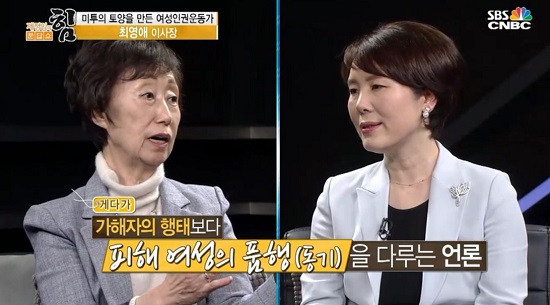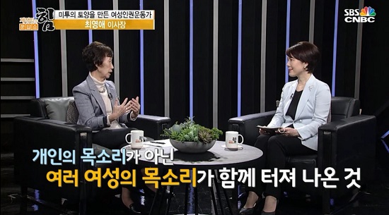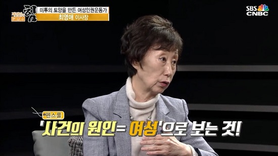 1991년 한국 최초의 성폭력상담소를 열고 여성인권운동에 앞장서 온 최영애(68) 여성인권을지원하는사람들 이사장이 19일 SBSCNBC <제정임의 문답쇼, 힘>에 출연했다. 그는 전 세계적으로 일어나고 있는 ‘미투(MeToo)’ 운동이 거스를 수 없는 ‘혁명적 물결’이라고 평가하면서, 권력형 성폭력 해결을 위한 제도적 대책과 함께 사회인식의 변화도 필요하다고 지적했다.
