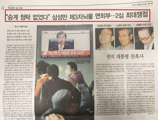 <한겨레>는 지난 7일치 4면에서 ‘“승계 청탁 없었다” 삼성만 제3자뇌물 면죄부…2심 최대쟁점’ 제목의 기사에서 “롯데·SK ‘부정한 청탁’은 인정”하면서 “삼성엔 다른 잣대로 판단”했다고 보도했다. 그러면서 검찰과 특검이 ‘부정한 청탁’을 어떻게 입증하느냐가 2심 재판의 관건이 될 것이라고 분석했다.