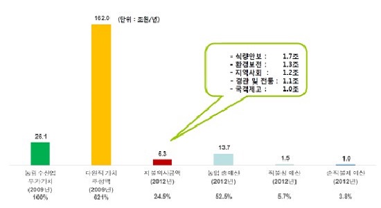 농업의 다원적 기능에는 환경보전 기능, 사회문화적 기능, 농촌 활력 유지 기능, 식량안보 기능이 있다. 또 주거·범죄·교통 등 도시 과부하로 발생하는 문제를 농촌이 완화해주는 도시문제 비용 절감 효과도 있다. 이를 고려하면 농업의 다원적 기능은 더 높게 평가될 수 있다.