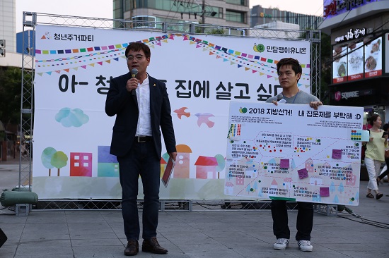 그렇게 지방선거가 흘러가고 있던 6일 저녁 6시 30분 신촌 유플렉스 앞에서 열린 ‘청년주거파티, 청년들도 집에 살고 싶다’ 행사에 청년 서울시장 후보들이 참석해 청년주거문제 해결을 역설했다. 청년주거권 확보를 위한 시민단체 민달팽이유니온이 6월 3일 무주택자의 날을 기념해 만든 자리였다.