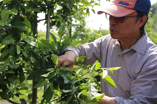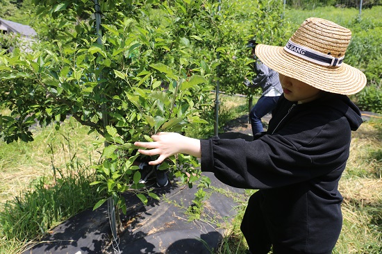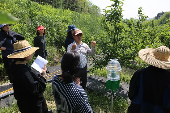 답사반은 윤 교수의 지도로 적과하는 법을 배우고 본격적인 일손 돕기에 나섰다. 과수 농가는 5월이면 적과 작업이 한창이다. 적과란 좋은 과실을 얻기 위하여 너무 많이 달린 과실이나 꽃을 솎아내는 일을 말한다. 윤 교수는 “나무 스스로 꽃을 떨어뜨려 산아제한을 하지만 가지에서 떨어지지 않고 양분을 흡수하는 꽃들도 있기 때문에 직접 따줘야 실한 사과가 열릴 수 있다”고 했다. 윤 교수는 “일반 사과는 꽃이 피면 그중에서 제일 실한 중심과만 남기고 나머지를 모두 솎아주지만 미니사과는 작기 때문에 2~3개만 골라 제거해주면 된다”고 설명했다.