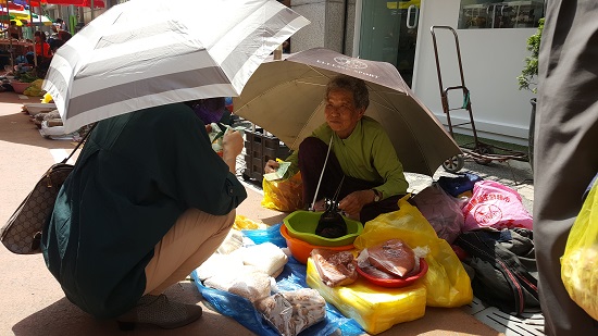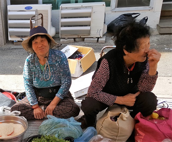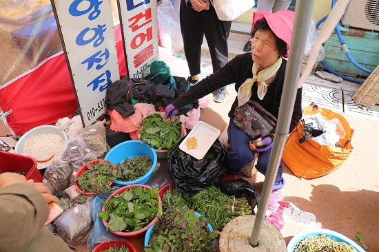 “내가 스물한 살에 시집왔는데 그때부터 집에서 농사지은 거 가지고 나와 팔았어. 평생 댕겼지. 여기 있는 할머니들 어지간하면 나이가 80이 넘어. 우리는 ‘전통할매’들이야. 나물 팔아서 자식 대학도 보내고, 장가도 보내고, 시집도 보냈지. 그러고 사는 거야. (살아온 세월) 못 잊어서 지금 늙어서도 나오는 거야.”