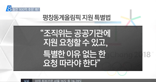 지난해 8월 23일자 기사 ‘한전 등 8백억 후원 약속… 공기업 '팔 비틀기'?’에서는 문재인 정부의 공기업 압력 행사 의혹을 제기했다. 그 근거로는 평창특별법을 문제 삼았다. 평창특별법의 “조직위는 국가나 공공기관에 재정적 지원 등을 요청할 수 있고 특별한 이유가 없는 한 조직위의 요청을 따라야 한다”는 조항이다. 김 기자는 그러나 평창특별법이 이명박 정부 때 만들어졌다는 사실은 보도하지 않고, 마치 문재인 정부가 불합리한 평창특별법을 제정해 공기업 팔 비틀기를 한 것처럼 보도했다.