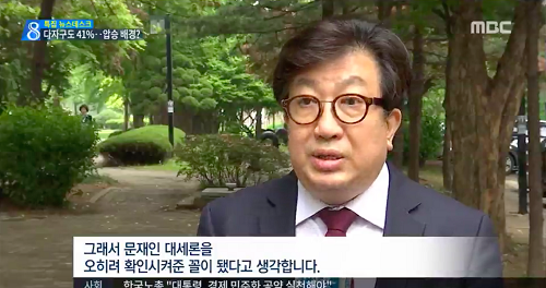 지난해 5월 대선 때 김 기자는 ‘다시 도전한 대권, 다자구도 속 압승 요인은?’이라는 리포트를 내보냈다. 문재인 후보의 높은 지지율을 분석하는 기사였는데 이 리포트에 문 후보에 비판적인 취재원을 등장시켰다. 신율 명지대 교수는 "(우파 유권자에게) 홍준표 후보는 좀 과격하고 안철수 후보는 좀 못 미덥고, 이러니까 투표장에 안 갔고요. 그래서 문재인 대세론을 오히려 확인시켜준 꼴이 됐다고 생각합니다"라고 말했다. 이는 문 후보의 높은 지지율이 적극적 지지라기보다는 차선의 지지라는 점과 많은 보수 유권자들의 기권으로 문 후보 대세론이 굳어지고 있는 것처럼 들리게 하는 리포트다.