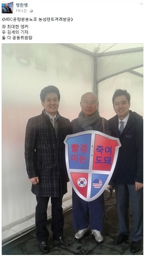 그는 이날 집회에서 ‘빨갱이는 죽여도 돼’라는 팻말을 든 집회참석자와 기념사진을 찍기도 했다. 팻말을 든 사람은 ‘일베 스님’으로 알려진 정한영씨로, 페이스북에 ‘MBC 공정방송노조 농성텐트 격려 방문. 좌 최대현 앵커, 우 김세의 기자. 둘 다 공동위원장”이란 글을 올렸다.