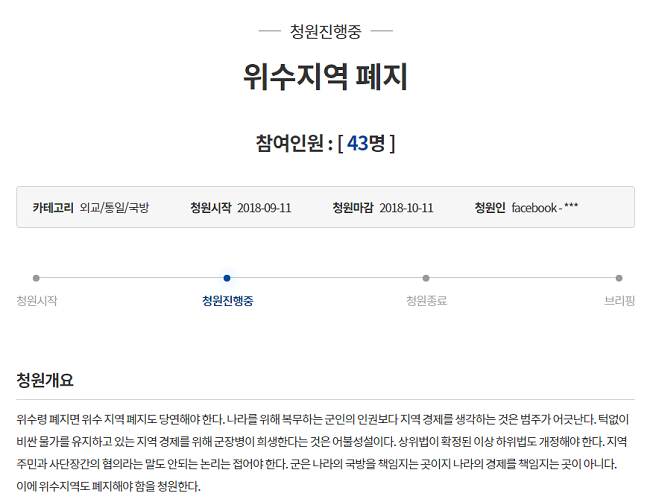 지난 9월 11일 문재인 대통령 주재로 열린 국무회의에서 위수령 폐지령안이 의결되면서 청와대 국민청원게시판에는 위수지역 폐지 청원이 올라왔다. 지난 2월 국방부가 군적폐청산위원회 권고로 위수지역 폐지 방침을 발표했다가, 접경지역 주민들 반발로 흐지부지됐던 위수지역 폐지 목소리가 다시 수면 위로 떠오른 것이다. 국민청원게시판에는 위수령 폐지 직후, 군 장병들의 외출∙외박 제한 지역인 위수지역 폐지 청원이 앞에 소개한 것을 포함해 세 건 올라왔다.