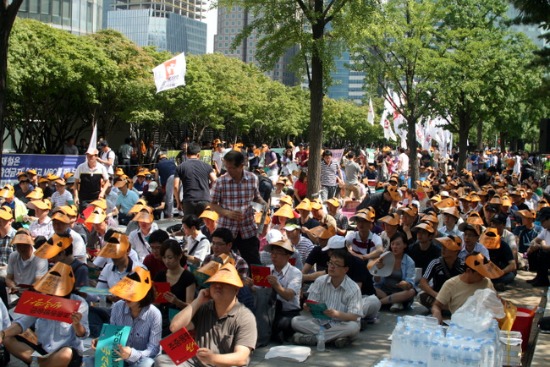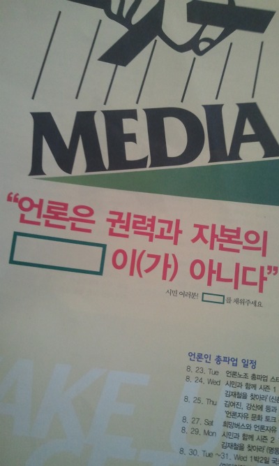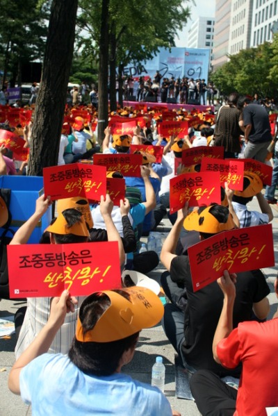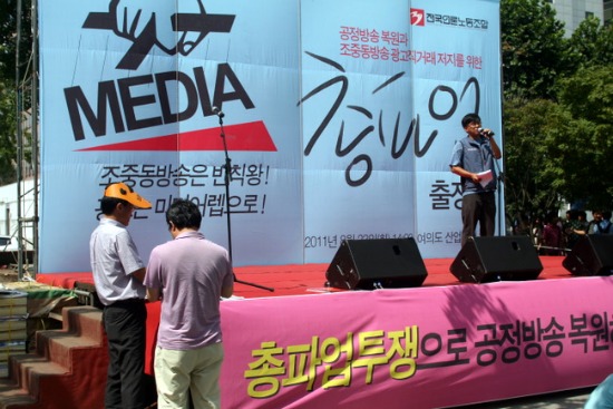 전국언론노동조합이 23일 오후 2시 서울 여의도 국회 앞에서 ‘공정방송 복원과 조중동방송 광고직거래 저지를 위한 총파업 출정식’을 갖고 언론노동자의 연대투쟁을 선포했다. 이날 출정식에는 언론노조 산하 112개 사업장 중 파업찬반투표를 한 70개 사업장에서 1000여 명의 조합원이 참여했다.
