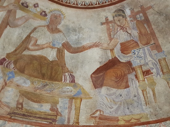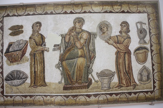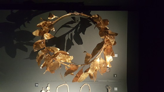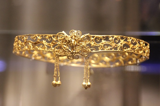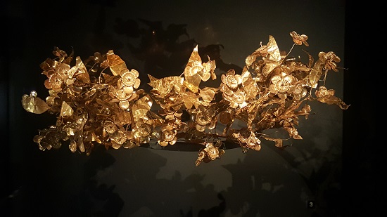 불가리아 카잔룩의 트라키아 고분으로 발길을 돌린다. B.C5세기-B.C4세기 만들어진 석실묘 내부는 당시 무덤에 묻힌 주인공의 일상 삶을 그림으로 표현했다. 무덤 주인공 부부가 정다운 포즈로 호화로운 의자에 앉은 모습을 보자. 남편은 오른손에 그릇을 들고 음료를 마시는 중이다. 눈을 감고 고개를 숙인 아내나 남편 모두 머리에 반짝이는 노란색 관을 썼다. 금관일 가능성이 높지만, 확인할 방법은 없다. 분명한 것은 일상은 몰라도 부장품으로 화려한 금관이나 금동관을 넣은 점이다. 그리스도 마찬가지다. 아테네 고고학 박물관으로 가면 카잔룩의 트라키아 고분과 비슷한 시기 만들어진 도자기 그림이 반겨준다. 침대에 앉아 옷을 벗고 있는 여인이 머리에 쓴 관이 반짝인다. 역시 금관으로 추정된다. 로마 시대로 넘어가도 비슷한 일이 벌어진다. 폼페이에서 발굴한 프레스코 그림을 보면 로마 여인들은 머리에 금으로 만든 망사를 써 멋을 냈다. 튀니지 수도 튀니스의 바르도 박물관에 전시중인 로마 모자이크는 귀족 부인의 치장모습을 담았다. 귀걸이는 물론 진주목걸이와 여러 개의 금팔찌를 찼다. 머리에는 노란색 관을 썼는데, 금관으로 보인다. 이렇게 실제 썼을 가능성이 있는 금관들이 남아 있을까?