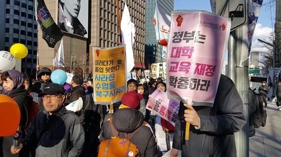 ‘강사제도 개선과 대학 연구교육 공공성 쟁취를 위한 공동대책위원회’(강사공대위)가 개최한 이날 집회에 학생들도 합세해 '시간강사 대량 해고로 학생들이 2차 피해를 입고 있다'며 ‘수업과목 복구투쟁’에 들어간 것이다.
