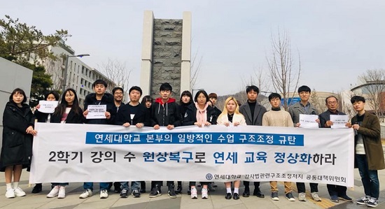 강사 수 감축에 따른 수강과목 축소에 대한 학생들의 항의에 대학당국은 “강사법 시행과 무관한 일”이라며 “시대 변화에 부응하기 위한 과목 조정”이라고 주장했다. 연세대 대학본부측은 “강사법을 이유로 한 강좌 감축은 없다”며 “글로벌 리더를 양성하고 시대 흐름에 부응하는 교육을 실시하기 위해 과목 조정을 하고 있다”고 주장했다. 본부측은 “강사법이 시행되는 오는 2학기에는 인위적으로 수업을 줄이지는 않을 것”이라며 “연세대 커리큘럼 체계의 본질적인 부분을 치열하게 고민하겠다”고 덧붙였다.