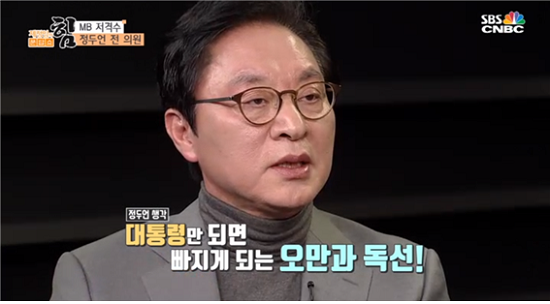 이명박 정권 탄생의 ‘1등 공신’에서 ‘엠비(MB·이명박) 저격수’로 변신한 정두언(62) 전 국회의원이 28일 SBSCNBC <제정임의 문답쇼, 힘>에 출연, 뇌물·횡령 혐의 등으로 재판을 받고 있는 이 전 대통령을 거침없이 비판했다. 이 전 대통령이 서울시장이었을 때 서울시 정무부시장을 지냈고 17~19대 국회의원으로도 활동한 그는 “대통령을 지켜드렸어야 했는데 그러지 못해 마음이 편치 않다”고 털어놓기도 했다.