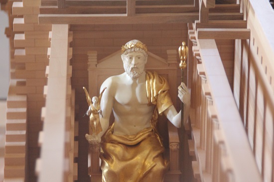 훗날 B.C 2세기 헬레니즘 시대 그리스인들이 7대 불가사의의 하나로 정한 제우스 동상은 받침대를 포함해 높이 12m다. B.C 5세기 그리스문명권 최고의 조각가이던 아테네의 페이디아스가 조각을 책임졌다. 올림피아에는 당시 페이디아스의 작업장이 발굴돼 있을 정도다. 지금은 터만 남은 제우스 신전과 완전히 사라진 제우스 조각을 1997년 프랑스 루브르 박물관이 50분의 1 크기로 줄여 복원해 놓았다. 루브르 박물관에 가서 보면 흰 대리석으로 제작한 제우스 조각은 머리에 금관을 썼다. 다신교 사회인 고대 그리스에서 최고신 제우스에게만 금관을 씌웠을까?