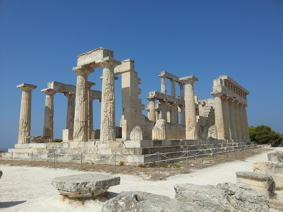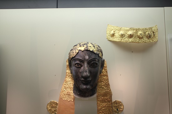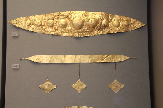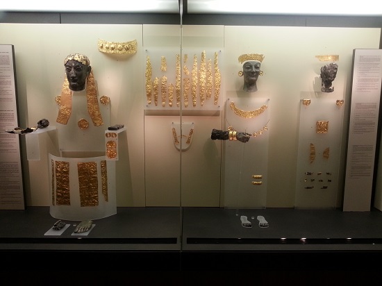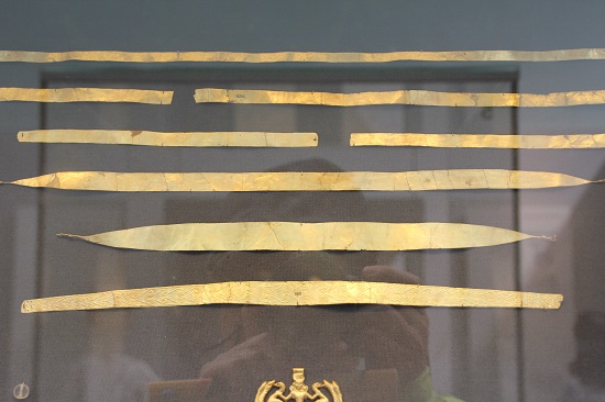 그 가운데 아테네 앞바다 아이기나 섬에서 출토한 B.C1850년-B.C1550년 미케네 시기(일부 미노아 문명설도 있음) 황금유물도 다수 전시중이다. 그중 금관(Diadem)의 일부를 이루던 얇은 금박 테 대륜(臺輪)이 눈길을 끈다. 아이기나 섬은 아테네 관문 피레우스 항에서 배를 타고 간다. B.C480년 아테네가 페르시아와 살라미스 해전을 치러 승리를 거두던 살라미스 해협을 지나 1시간 20분여 거리다. 섬 북쪽에 위치한 도리아식 아파이아 신전은 아테네 동쪽 수니온 곶의 포세이돈 신전과 함께 바다를 배경으로 한 경치가 일품인 신전으로 꼽힌다. 띠 형태로 남아 있는 아이기나 금관 테만 보면 이것이 어떻게 금관의 일부라는 것인지 의문이 든다. 이런 의문은 미케네 금관 유물을 더 찾아보면 자연스레 풀린다.