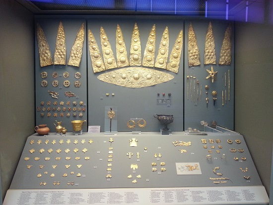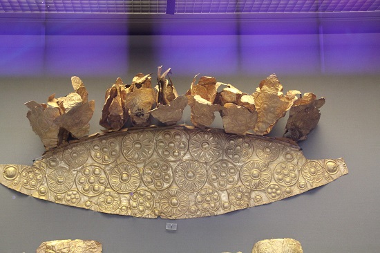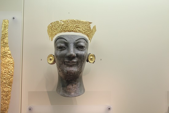 신전 폐허 아래 델포이 박물관으로 장소를 옮기자. 신전에서 출토한 돌 옴팔로스 옆으로 태양신 아폴론과 여동생인 달의 여신 아르테미스, 두 쌍둥이 남매의 어머니인 레토. 이렇게 3명의 조각이 탐방객을 맞아준다. 레토가 제우스와 관계해 남매를 낳은 건 에게해 델로스 섬이지만, 아폴론을 모시는 최고 성역소는 이곳 델포이였다. 나무로 아폴론을 조각한 뒤, 각종 금과 도금장식물로 화려하게 꾸몄다. 머리에는 은판으로 틀을 만든 뒤, 금을 얇게 입힌 도금관을 씌웠다. 아폴론 뿐 아니라 여동생 아르테미스, 어머니 레토 역시 같은 기법으로 조각하고 금 장식물을 붙였다. B.C6세기 이오니아 스타일이라는 설명문이 붙었다. 앞서 살펴 본 마케도니아 왕국의 금관 제작 시기 신도 금관으로 장식했음을 보여준다. 그렇다면 그리스 문명권에서는 언제부터 금으로 관을 만들어 사용했을까?