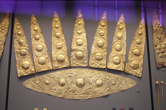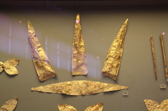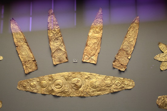 아테네 고고학 박물관 1층 미케네 전시실로 가면 일단 입을 다물지 못한다. B.C17세기-B.C16세기 미케네 문명 유적지에서 출토한 황금유물이 전시장을 가득 메우기 때문이다. 지구촌 황금유물의 보고(寶庫)라는 표현이 무색하지 않다. 다수의 황금유물을 소장한 박물관은 여럿이지만, 이렇게 앞선 시기 그것도 이렇게 많은 분량의 황금유물을 소장한 곳은 지구촌 어디에도 없다. 이제 관심을 황금유물에서 금관에 집중시켜보자. 대영박물관에서 아이기나 금관 테처럼 조금은 넓은 금박 띠, 즉 금관의 원형 테두리인 대륜(臺輪)이 많이 보인다. 시선을 옆으로 옮기면 대륜 위에 세움 장식을 단 금관들도 눈에 들어온다. 신라 금관의 세움장식이 ‘출(出)’자 형 나뭇가지와 사슴뿔이고, 고구려 관모 세움장식이 새깃털이나 화염무늬라면 미케네 세움장식은 뾰족한 삼각형이다. 3개, 4개, 7개를 넘어 더 많은 장식도 보인다.