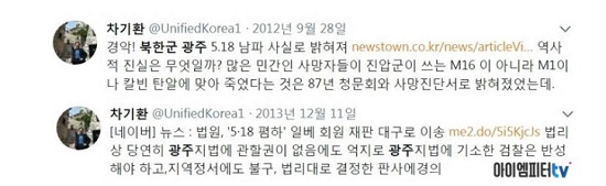 2012년 9월 28일 차기환 MBC 방문진 이사는 극우 성향 인터넷매체 <뉴스타운>의 ‘경악! 북한군 광주 5·18 남파 사실로 밝혀져’라는 기사를 트위터에 공유해 퍼뜨렸다. 그는 트위터에서 ‘역사적 진실은 무엇일까? 많은 민간인 사망자들이 진압군이 쓰는 M16소총이 아니라 M1이나 칼빈 탄알에 맞아 죽었다는 것은 87년 청문회와 사망진단서로 밝혀졌었는데’라며 극우매체의 ‘북한군 광주 남파설'을 퍼 날랐다.