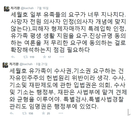 차 이사는 이처럼 세월호 유가족을 폄훼하고 왜곡해 놓고도 유가족들 반대를 무릅쓰고 새누리당 추천 세월호 특별조사위원회 위원으로 활약했다. 정치적 중립과 공정성을 지켜야 할 MBC 방문진 이사직을 가진 채 새누리당을 대변하는 세월호 진상조사위원으로 참여해 공영방송의 정치적 중립과 공정성을 훼손한 것이다.
