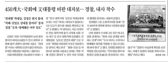 <조선일보>는 4월 2일자 A14면에 ‘450개大·국회에 文대통령 비판 대자보···경찰 내사 착수’란 제목의 기사를 내보냈다. 큰 제목 아래 ‘전대협 학생들, 김정은 편지 흉내’, ‘“적폐·친일로 몰아라” 풍자’ 등 부제를 달아 보도했다.