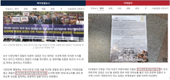 <파이낸셜뉴스>는 15일 기사에서 ‘‘시민단체 행동하는 자유시민’은 15일 서울 미근동 경찰청 청사 앞에서 기자회견을 열고 경찰의 전국대학생대표자협의회(전대협) 수사에 대해 ‘반대 목소리를 내지 못하도록 국민을 겁박하는 공권력 남용’이라고 비판했다’고 썼다.