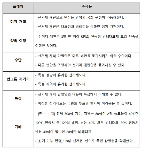 제목 프레임은 제목의 핵심 키워드를 기준으로 구분했다. 본문 프레임은 각 기사 본문에서 핵심적으로 나타나는 주제를 기준으로 프레임을 나눴다. 1개 이상 주제가 나타나면, 리드 문장의 주제, 주제와 관련된 문장이나 문단의 양을 기준으로 핵심 프레임을 도출했다. 또한 ‘선거제 개혁 단일안’ 이외 이슈를 포함한 기사에서는 선거제 관련 문단만을 분석 대상으로 삼아 프레임을 구분했다.
