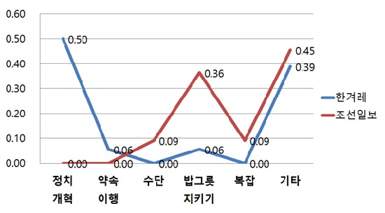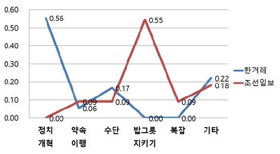 <한겨레>는 <조선>보다 주요 프레임 강조에 적극적이었다. <한겨레>는 선거제 개편안 관련 기사 18건을 내보내 <조선>보다 7건 더 많았다. 분석기간에 ‘정치 개혁’ 프레임을 부각하기 위해 사설, 기획기사 등 다양한 형식을 활용하여 심층보도했다.