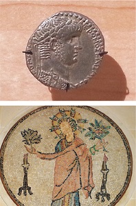 예수 그리스도의 양팔 아래로 유대인들이 신성시하는 7갈래 촛대 메노라(Menorah)를 축약시킨 형태의 촛대가 놓였다. 후대 지워진 것으로 추정되는 예수님 얼굴 뒤로는 신을 상징하는 둥근 후광이 뚜렷하다. 머리를 보자. 우리의 관심사, 예수 그리스도 머리에 가시관을 씌웠을까? 모자이크를 찬찬히 뜯어보면 가시관이 아니다. 고난을 상징하는 가시 대신 봄꽃의 여왕 장미 화관을 쓴 모습이다. 4세기 기독교 모자이크에서 예수님 머리에 장미 화관을 씌우는 기법은 어디서 나온 것일까?