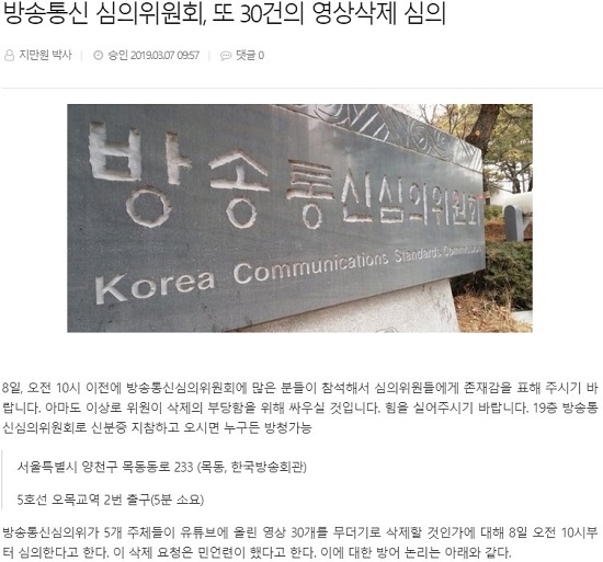 지만원 씨 자신이 직접 작성한 이 기사는 방심위 심의 대상인 영상 목록과 함께 영상을 삭제해 달라고 한 요청자가 민주언론시민연합(민언련)이라고 공개했다. 지 씨는 기사에서 ‘8일 오전 10시 이전에 방송통신심의위원회에 많은 분이 참석해서 심의위원들에게 존재감을 표해 주시기 바란다”고 요청했다. 그는 이어 “아마도 이상로 위원이 삭제의 부당함을 위해 싸우실 것이니 힘을 실어 달라”며 노골적으로 지지자들이 방심위로 몰려와 심의위원들을 압박해줄 것을 유도했다.