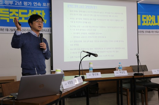 황선웅 부경대 교수는 ‘소득주도성장과 산업생태계 혁신: 평가와 과제’를 발표하면서 “문재인 정부가 2017년 출범 당시에는 분배와 성장이 선순환을 이루는 ‘사람 중심 경제’를 제시했다”며 소득주도성장, 일자리 중심 경제, 비정규직 문제 적극 해결 등을 예시로 들었다. 그러나 최근 나타나는 정책 변화 기조에는 비판적이었다. 그는 “2년이 지나며 구상이 많이 깨져 투자 활력, 규제 완화, 수출경쟁력 강화 등 친기업 정책이 부활하고 있다”고 말했다.