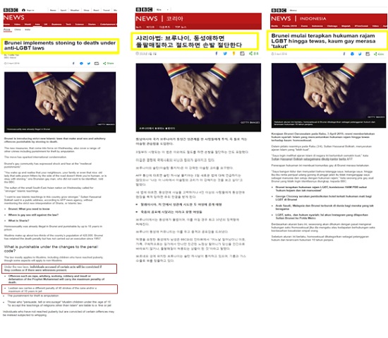 브루나이에서 최근 개정된 새로운 법을 예로 들어보자. 3개 언어로 전해진 BBC 뉴스는 별 차이가 없어 보인다. 영어판 원문 기사 제목은 '브루나이 반-성소수자(LGBT) 법 위반자 죽을 때까지 돌팔매질’이다. 이 제목을 읽는 독자들은 이 기사가 브루나이 성소수자들의 사형에 초점을 맞추고 있다고 이해할 것이다.
