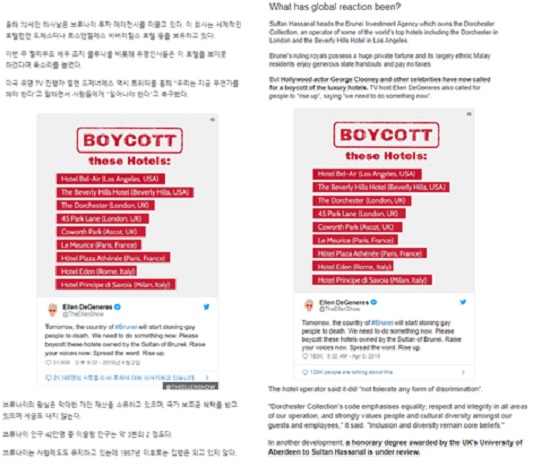 브루나이의 새로운 ‘반-성소수자 법’은 인권 위배라는 이유로 세계적인 이슈로 떠올랐다. 이런 이유로 아래 그림과 같이 영어와 한국어권 두 곳 다 이 사건에 반응을 보였다. 미국의 유명 TV 프리젠터 엘렌 드제너스는 트윗을 통해 그녀의 지지자들이 미국과 유럽에 있는 브루나이 술탄의 호텔을 비롯한 자산을 보이콧하도록 설득했다. 영어 기사에는 다른 헐리우드 스타들 반응도 링크돼 있다.