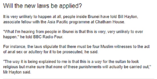영어판 기사에는 마지막 부분에 빌 헤이튼이 BBC 라디오4와 인터뷰한 내용을 실었다. 헤이튼은 술탄이 새로운 이슬람 율법을 종교적인 것처럼 보이게 하려고 한다면서, “어떤 처벌도 실제로 가해지지 않도록 해야 한다”고 말했다.