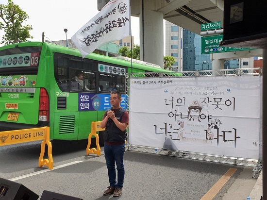 “자식들한테 어른 말 잘 들어라, 선생님 말 잘 들어라 절대 그런 말하지 마십시오. 그러다가 물에 빠져 죽든가 기계에 깔려 죽습니다. 대한민국 현실이 그렇습니다. 자식들한테 애 낳으라고 말하지 마십시오. 그럴 권리 없습니다.”