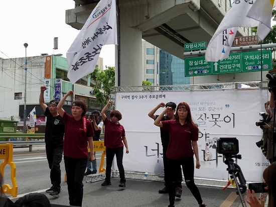 추모제에서 서울교통공사 노조원들이 노동자 차별 철폐를 촉구하는 공연을 펼쳤다. 절도있는 군무를 선보인 주범중 씨는 올해로 23년 째 노조활동을 하고 있다. 주 씨는 1997년 서울교통공사에 정규직으로 입사했다. 그는 “비정규직은 정당한 대우를 받지 못하고, 노조도 없이 개인이 사장에게 부당함을 이야기해야 하는 어려운 구조였다”며 함께 추모하는 이유를 설명했다. 그는 “임금격차가 심해지는 사회 구조를 바라보지 않고 나만 바라보면 여기 있는 비정규직은 남이 될 수밖에 없다”며 “모두가 피해를 볼 수 있는 상황임을 알아줬으면 좋겠다”고 덧붙였다.