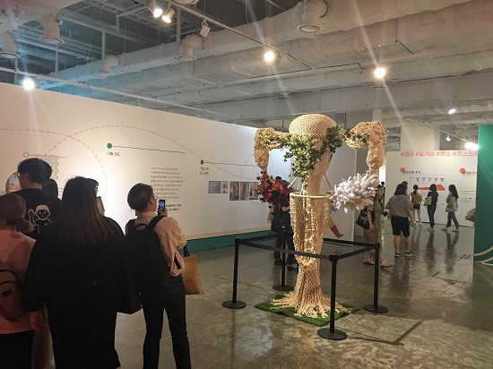 전시 초반, 거대한 조형물이 눈길을 사로잡았다. 활동명 ‘위클리 제이’로 활동하는 이경진 작가가 실이나 끈을 매듭지어 여러가지 모양을 내는 마크라메 기법으로 만든 수공예품인데, 여성의 포궁(자궁)을 나무 모양으로 형상화한 설치미술작품 ‘Womb Tree’였다. ‘포궁은 때로는 여성을 아프게 하지만, 건강지표이자 생명의 나무라는 점에서 우리 삶을 닮았다’는 기획의도가 적혀있다.