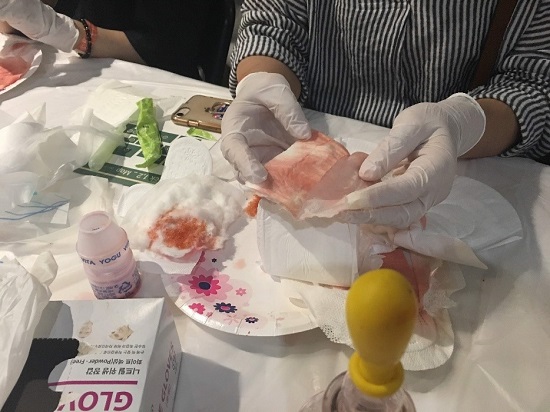 생리대 표면에 식용색소를 뿌리고 단면을 자르자, 고분자흡수체(SAP, Super Absorbent Polymer) 알갱이가 색소와 반응해 눈에 보였다. 고분자흡수체는 많은 생리대에 사용되는 합성화학물질로 자기 부피의 수백배에서 수천배의 물을 흡수할 수 있어 생리대, 기저귀, 제습제 등에 쓰인다. 오 대표는 “고분자흡수체가 인체에 유해한지, 무해한지에 관해서는 갑론을박 중이다”며 이번 실험을 통해 자신이 사용하는 월경용품을 뜯어보는 데 의의가 있음을 강조했다.