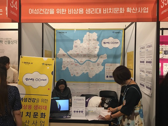 행사를 후원한 서울시도 ‘여성건강을 위한 비상용생리대 비치문화 확산사업’ 홍보를 위해 부스를 운영했다. 지난해 10월 서울시는 3개월간 청소년∙여성이 이용하는 11개 공공기관에 비상용 생리대 자판기를 설치해 시범사업을 했다. 갑자기 생리를 하거나 생리대를 준비하기 어려운 사람을 위한 것으로, 기관 안내데스크에 비치된 코인을 넣거나 레버를 돌리면 생리대를 무료로 쓸 수 있다. 서울시는 1곳당 하루 평균 생리대 3.68개를 사용해 남용 문제가 발생하지 않았다고 밝혔다. 공공재(公共財)로서의 생리대팀 위창희(52) 팀장은 “만족도가 높아 올해부터 서울시 공공기관 200곳으로 설치를 확대하기로 했다”며 사업에 대한 설명을 이어갔다.