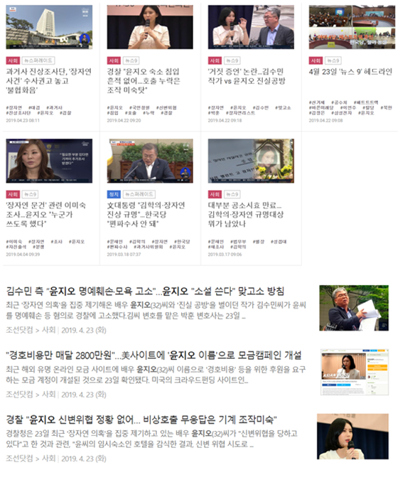 ‘윤지오 카톡 논란’이 일어난 4월 23일, <조선>은 3건의 기사를 추가로 보도했다. ‘경찰, "윤지오 신변위협 정황 없어….비상호출 무응답은 기계 조작 미숙"’, ‘"경호비용만 매달 2800만원" 美 사이트에 '윤지오 이름'으로 모금캠페인 개설’, ‘김수민 측 "윤지오 명예훼손•모욕 고소"….윤지오 "소설 쓴다" 맞고소 방침’이 그것이다. ‘윤지오 이름’이나 ‘경호 비용만 2800만’ 등 기사 제목은 대부분 윤 씨에게 반감이나 의구심을 가지게 하는 제목이다.