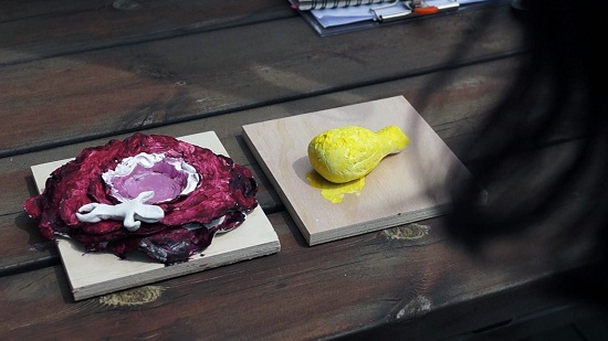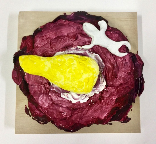 밤율 님의 작품은 참 오묘했습니다. 지점토를 얇게 펴 층층이 쌓아 올리고 가운데를 작게 움푹 판 그릇이었어요. 짙게 칠해진 팥죽색 접시 위에는 아무것도 칠하지 않은 하얀 사람이 벌러덩 누워 있습니다. 그리고 샛노란 치킨 한 조각은 아직 마르지 않아 옆에 따로 두었습니다.