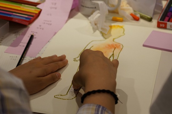 [몸 한끼, 맘 한끼] 세 번째 시간은 ‘나의 밥이 곧 나다’라는 주제로 수업을 진행했습니다. 음식이 몸뿐 아니라 마음에도 영향을 준다는 리플렛 자료 <음식이 마음에 보내는 신호>를 함께 읽었어요. 그리고 내 몸의 실루엣을 그린 뒤, 지난 한 주간 먹은 음식을 떠올리며 내 몸-마음의 상태를 실루엣 안에 표현했지요. 파스텔로 부드럽게 문지른 작품, 뾰족한 선으로 쭉쭉 그은 작품, 작은 동그라미로 몸을 가득 채운 작품도 있었어요.