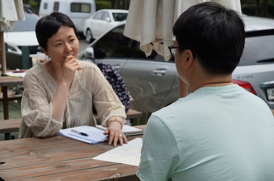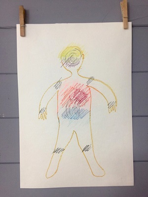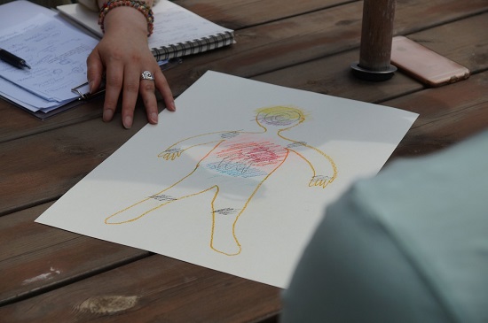 그중 많은 빗금이 쳐있는 김정엽 님의 작품에 눈이 갔습니다. 혼란스러운 마음과 지쳐있는 몸의 상태가 느껴졌거든요. 머리는 윗부분이 노란색으로 칠해져 있고 가운데는 소용돌이가 그려져 있습니다. 가슴 부위는 붉은색으로 배는 파란색으로 표현됐지요. 손과 발, 어깨는 까만색으로 그어져 있었어요. 정엽 님께 작품 인터뷰를 요청했고 흔쾌히 응해주었습니다.