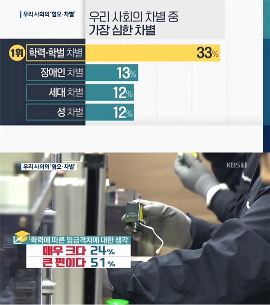 지난 1월 한국방송(KBS)과 한국리서치가 전국 만19세 이상 성인 1000명을 대상으로 실시한 ‘혐오와 차별’ 여론조사에서도 우리 사회에서 가장 심각한 차별로 ‘학력 및 학벌 차별’을 꼽은 사람(33%)이 가장 많았다. 특히 학력 차별에 따른 ‘임금 격차’에 대해 응답자 4명 중 3명이 ‘큰 편이다’ 혹은 ‘매우 크다’고 지적했다.