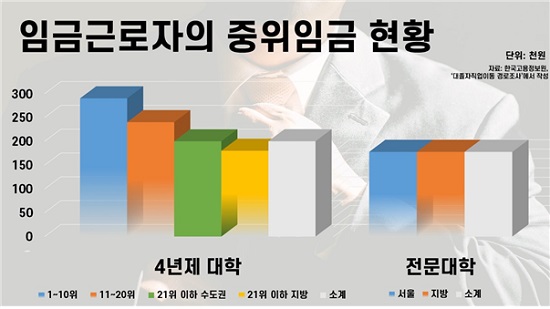 이런 차이는 임금 격차로 이어진다. 한국직업능력개발원 오호영 연구위원이 <청년층 취업난의 원인과 정책과제(2015)> 보고서에서 임금근로자 전체의 대학 서열에 따른 임금 격차를 분석한 결과, 언론사 평가 1~10위 대학 출신 근로자의 월평균 중위임금은 290만원인 반면 21위 이하 지방대 출신의 월평균 중위임금은 180만원에 불과했다. ‘중위임금’은 전체 근로자를 임금 기준으로 1위부터 최하위까지 줄 세웠을 때 가장 중간에 위치한 사람이 받는 임금을 말한다.