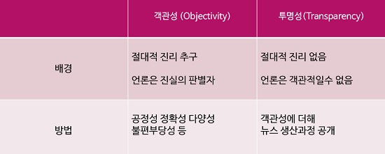 공정성, 정확성, 다양성을 아우르는 언론의 객관성도 중요하지만 21세기 디지털 저널리즘에 들어서면서 ‘투명성’을 강조한다. 모더니즘적 사고에서는 ‘기자들이 열심히 취재해서 기사를 쓰면 진리에 도달할 수 있다’고 생각했지만 포스트모더니즘적 사고로 넘어오면서 ‘진실에 도달할 수 없고 다만 진실을 재구성할 테니까 (독자들이) 한번 판단해보라’로 바뀌었다. 이때 기자가 판단한 진실에 도달하는 과정에서 어디서 소스를 얻었는지 모두 공개하는 게 중요하다.