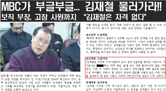 “김재철은 정치부 기자 시절부터 오직 정계 진출만을 꿈꿨던 사람이다. 기자로서는 ■■■했고, 하루 종일 ‘줄’을 잡기 위해 돌아다녔던 걸로 기억한다. 지금 이 사람이 원하는 건 오로지 정계 진출을 위해 필요한 MBC 사장 타이틀이 전부다.” (2010년 4월 13일 자 <MBC 총파업특보> ‘김재철을 바라보는 보직 부장과 고참 사원들의 한마디’)