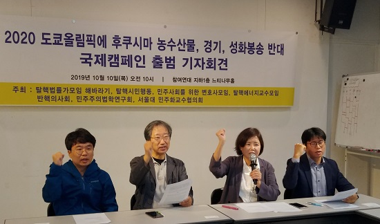 10일 오전 10시 서울 통인동 참여연대 느티나무홀에서 ‘2020 도쿄올림픽 후쿠시마 농수산물, 경기, 성화봉송 반대 국제캠페인 출범’ 기자회견이 열렸다. 탈핵법률가모임해바라기, 탈핵시민행동, 민주사회를위한변호사모임 등 7개 단체가 주최한 기자회견에서 김영희(54) 탈핵법률가모임해바라기 공동대표는 캠페인의 취지를 이렇게 설명했다. 참가단체들은 ‘도쿄올림픽 선수촌에 후쿠시마 인근 농수산물을 공급하지 말라’ ‘후쿠시마현에서 야구와 소프트볼 경기를 하지 말라’ ‘올림픽 성화봉송을 후쿠시마현에서 하지 말라’ 등 3개항을 요구했다.