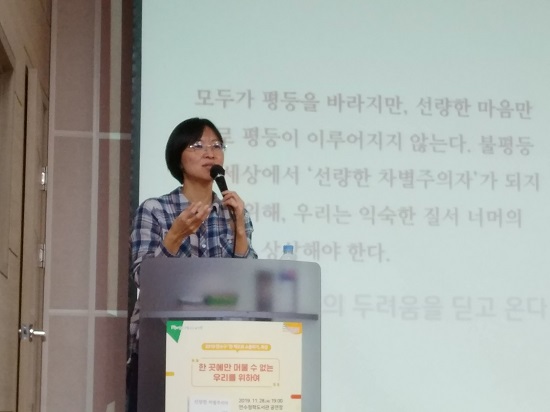김 교수는 질의응답 시간에 “나도 선량한 차별주의자였던 것 같다”는 조혜진(43·인천 연수구)씨 이야기를 듣고 “이런 고민을 한다는 것 자체가 감사한 일”이라고 말했다. 그는 자신도 차별을 안 한다고 생각했지만 그 생각 자체가 얼마나 위험한 것이었는지 깨달았다고 덧붙였다. 김 교수는 “최소한 내가 차별할 수 있겠다고 마음을 열어놓으면 다른 사람의 이야기가 들리지 않을까 생각한다”며 “소수자가 얘기할 때 우리는 별로 안 듣는 경향이 있는데 표현의 자유를 존중하면서 귀 기울여 듣는 게 중요하다”고 말했다.