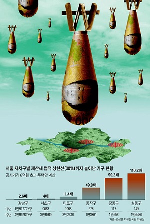 이: 수십년간 변하지 않고 등장하는 과장보도가 보수언론의 ‘세금폭탄’ 프레임입니다. <조선일보> 9월 23일 보도인데 ‘재산세 폭탄 맞은 가구, 강남 2.6배 성동 110배’라면서 서울에 수십 발 폭탄이 떨어지는 그래픽까지 동원했죠. 한 해 올릴 수 있는 재산세 법적 상한선이 30%예요. 성동구는 그렇게 오른 가구가 2017년 149가구에서 2019년 1만6420가구로 110배가 늘었다는 거죠. 근데 성동구는 ‘마용성’이라 해서 집값이 하늘 높은 줄 모르고 뛴 곳이잖아요. 당연히 내야 하는 세금이고 훨씬 더 많이 내야 하지만 한 해 30% 이상은 못 올리게 돼 있어요. 성동구 집주인들에게 집값 오른 것은 ‘폭탄’이 아니라 ‘폭죽’이죠.