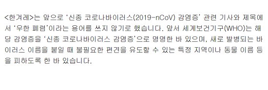 중국 우한에서 처음 보고된 원인 불명 폐렴을 일으키는 바이러스를 세계보건기구(WHO)는 1월 13일 ‘신종 코로나바이러스 2019’로 명칭을 잠정 결정했다. 정부는 1월 13일부터 ‘신종 코로나바이러스’(신종 코로나)라고 불렀으나 언론은 ‘우한 폐렴’과 ‘신종 코로나’를 혼용했다. 청와대는 1월 27일 기자들에게 ‘우한 폐렴’이 아닌 ‘신종 코로나’로 불러 달라고 당부했지만 대다수 언론은 지키지 않았다. 일부 언론사만 ‘앞으로 우한 폐렴 명칭을 사용하지 않겠다’고 밝혔다. 신문은 <한겨레>가 1월 28일 지면에서, 방송은 SBS가 1월 20일 8시 뉴스에서 ‘우한 폐렴을 쓰지 않겠다’고 천명했다.