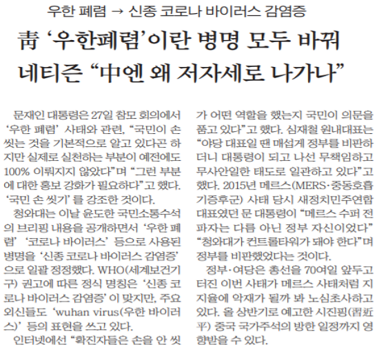 <조선>은 1월 29일 사설 ‘’우한 폐렴’ 反中 안되지만 與는 국민 건강 먼저 걱정하길’에서 ‘질병에 지역명을 쓰지 않는 것은 WHO의 권고사항일 뿐, 일본뇌염, 중동호흡기증후군, 아프리카돼지열병 등 지역명은 널리 쓰고 있다’며 ‘중국이 아닌 미국과 일본이 진원지라면 청와대가 나서서 표기를 바꾸라고 주장하지 않았을 것’이라 비판했다.